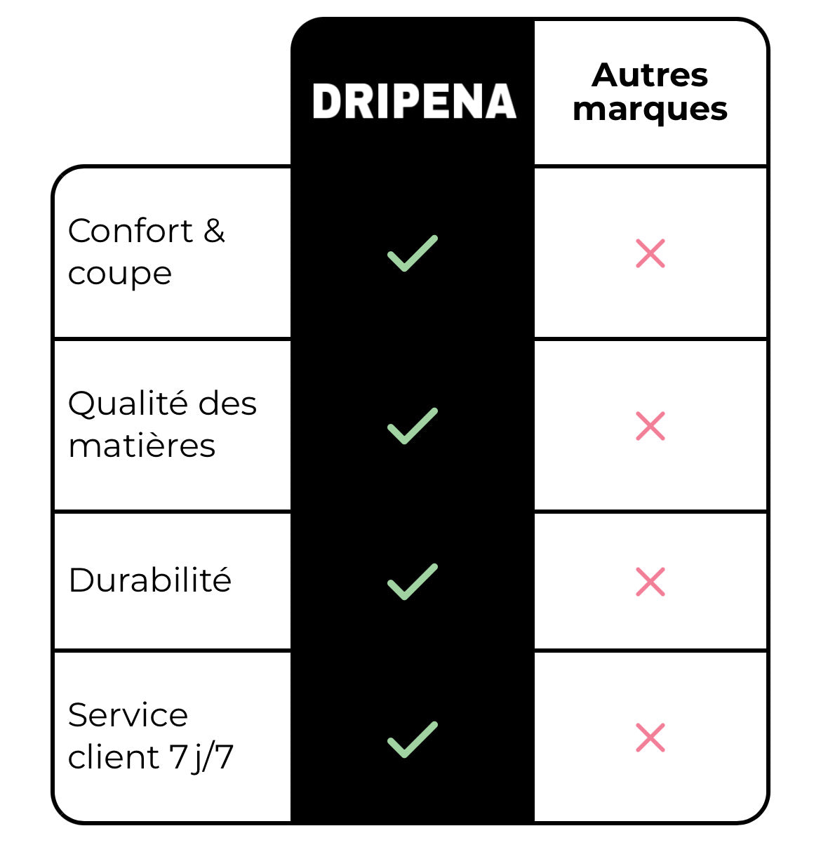 Nous comprenons vos doutes, surtout quand on découvre une marque. Mais soyez rassurée : DRIPENA est une marque française, enregistrée, avec un service client réactif, des avis clients authentiques, et un suivi de commande transparent avec numéro de suivi.
